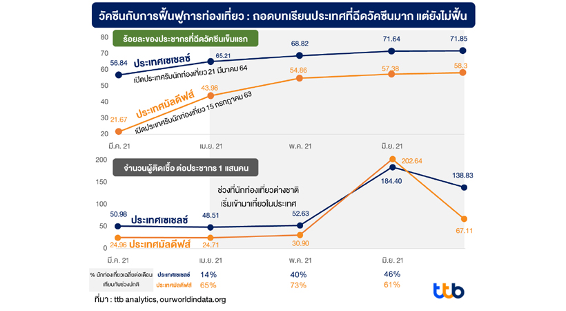 เมื่อถอดบทเรียนการเร่งฉีดวัคซีนให้ประชาชนได้รับวัคซีนในอัตราฉีดสูงและเปิดประเทศรับนักท่องเที่ยวต่างชาติ กรณีหมู่เกาะเซเชลส์ แม้ว่าในปัจจุบันจะมีอัตราการฉีดวัคซีนสูงถึง 71.5% แต่เมื่อมีการเปิดประเทศรับนักท่องเที่ยวในช่วงเดือนมีนาคม 2564 ที่ผ่านมา กลับพบการระบาดของเชื้อเฉลี่ยสูงขึ้น 3.8 เท่าตัว ในช่วงเดือนเมษายน ถึง มิถุนายน ในขณะที่ประเทศมัลดีฟส์ที่มีอัตราการฉีดวัคซีน 58.3% พบการระบาดสูงขึ้นกว่าเดิม 8.2 เท่าในช่วงเวลาเดียวกัน โดยจะเห็นว่าหลังจากเปิดประเทศแล้ว ทั้งสองประเทศยอดนักท่องเที่ยวเริ่มดีขึ้นในสองเดือนแรก แต่ในเดือนที่สามเริ่มพบยอดการติดเชื้อในประเทศเพิ่มสูงขึ้น ดังนั้น การเปิดรับนักท่องเที่ยวต่างชาติ ชี้ถึงโอกาสเสี่ยงในการรับเชื้อไวรัสที่แตกต่างจากสายพันธุ์ท้องถิ่น โดยเป็นสิ่งที่ไทยต้องตระหนัก