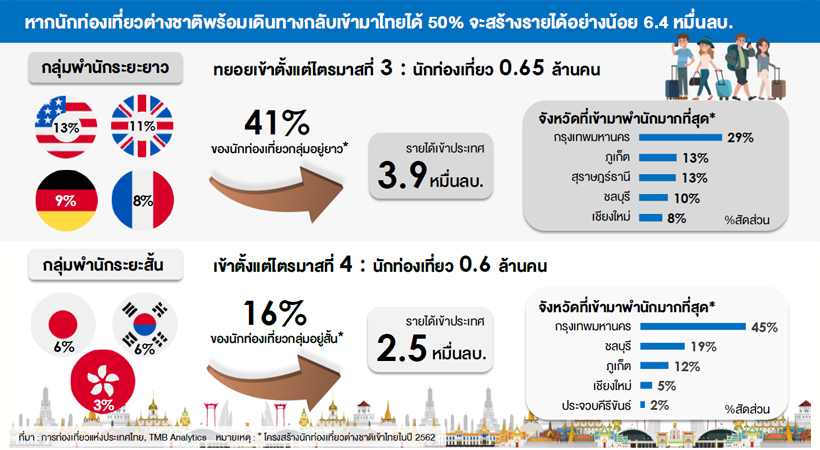 TMB Analytics ประเมินหากไทยพร้อมรองรับนักท่องเที่ยวได้ตั้งแต่ช่วงไตรมาส 4 นักท่องเที่ยวต่างชาสติที่จะกลับมามี ทั้งจาก ประเทศหลักในยุโรป สหรัฐอเมริกา และกลุ่มเอเชียตะวันออกบางประเทศ โดยหากดึงดูดนักท่องเที่ยวกลุ่มนี้ได้ 50% ของจำนวนเดิมก่อนโควิด จะสร้างรายได้กว่า 6.4 หมื่นล้านบาท
