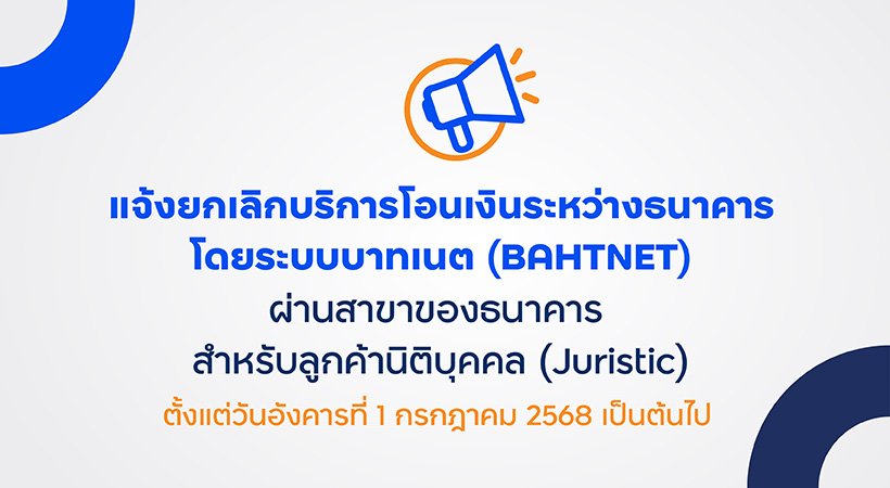 ธนาคารจะยกเลิกการให้บริการบาทเนต ผ่านสาขาของธนาคาร โดยท่านสามารถใช้บริการบาทเนตโดยส่ง “ใบคำขอถอนเงินและโอนเงิน BAHTNET/ ORFT” ผ่านทางสาขา ได้จนถึงวันจันทร์ที่ 30 มิถุนายน 2568 ภายในเวลา 14.30 น. เพื่อให้รายการมีผลในวันจันทร์ที่ 30 มิถุนายน 2568 เป็นวันสุดท้าย