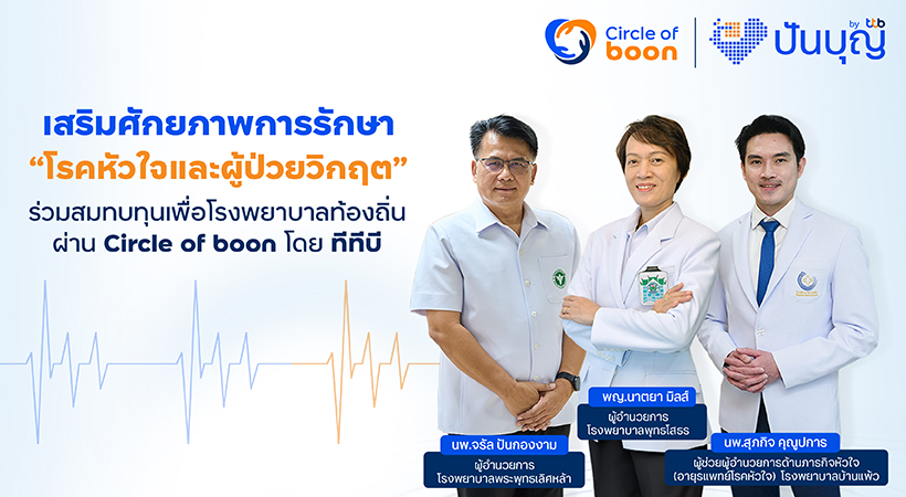 เพราะพลังแห่งการให้ เป็นวัฏจักรที่ไม่มีวันสิ้นสุด ทีทีบียกระดับบทบาทของธนาคารในฐานะผู้ขับเคลื่อนความยั่งยืนของสังคม กับการระดมเงินบริจาคเพื่อโรงพยาบาลท้องถิ่น ผ่านโครงการ “Circle of boon วัฏจักรพลังการแบ่งปัน” ที่ดำเนินการภายใต้ “ปันบุญ โดย ทีทีบี” ซึ่งผู้มีจิตศรัทธาสามารถร่วมบริจาคได้ทุกที่ทุกเวลา ผ่านเว็บไซต์ Punboon.org ที่ปลอดภัย เชื่อถือได้ และมีความโปร่งใสทุกขั้นตอน ให้ผู้บริจาคมั่นใจได้ว่า เงินทุกบาทส่งตรงถึงโรงพยาบาลอย่างแท้จริง และโรงพยาบาลท้องถิ่นได้ลงทะเบียน e-Donation กับกรมสรรพากร จึงเป็นทางเลือกให้ผู้บริจาคในการลดหย่อนภาษี 2 เท่าของเงินบริจาคอีกด้วย ขอเชิญชวนทุกคนมาร่วมเป็นส่วนหนึ่งของ “Circle of boon” วัฏจักรพลังแห่งการแบ่งปัน ทุกบาทของคุณสามารถเปลี่ยนชีวิตผู้ป่วยได้จริง และยั่งยืน