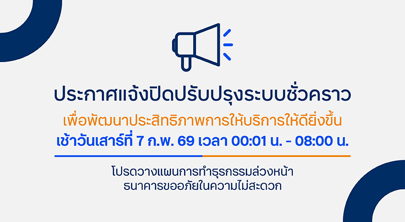 ในช่วงเวลาดังกล่าว ลูกค้าจะ ไม่สามารถทำธุรกรรมผ่านช่องทางดังกล่าวได้ และกรุณาวางแผนการทำธุรกรรมล่วงหน้า