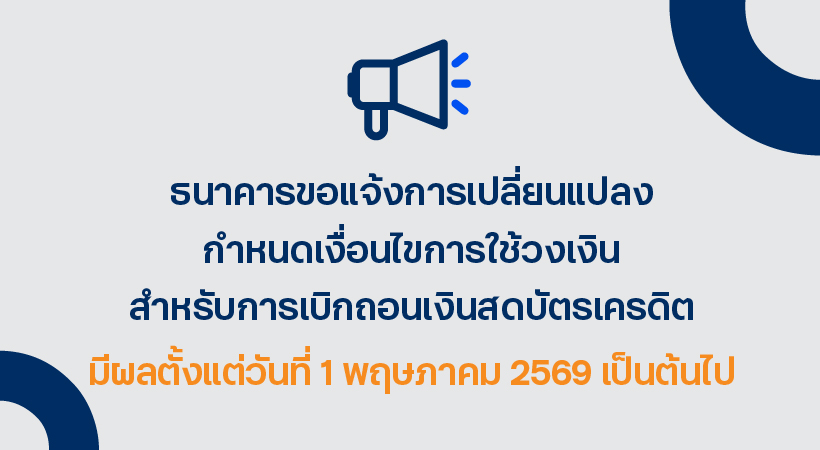 ตั้งแต่วันที่ 1 พฤษภาคม 2569 เป็นต้นไป ธนาคารมีความจำเป็นต้องจำกัดวงเงินการกดเงินสดของบัตรเครดิต ttb สำหรับการเบิกถอนเงินสดผ่านเครื่องถอนเงินอัตโนมัติ (ATM) หรือการเบิกถอนเงินสดล่วงหน้าผ่านแอปพลิเคชัน ttb touch