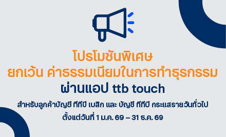 ธนาคารขอเรียนแจ้งยกเว้นค่าธรรมเนียมการทำธุรกรรม ผ่านแอป ttb touch สำหรับลูกค้าที่ใช้ บัญชี ทีทีบี เบสิก และ บัญชี ทีทีบี กระแสรายวันทั่วไป ในการทำธุรกรรม