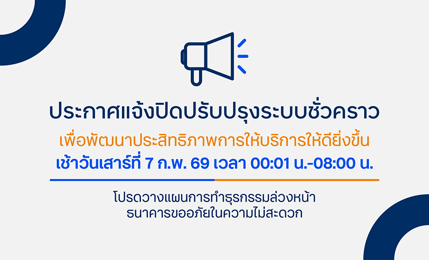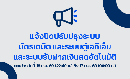 แจ้งปิดปรับปรุงระบบบัตรเดบิต และ ตู้ ATM/CDM ในวันที่ 16 - 17 มกราคม 2569