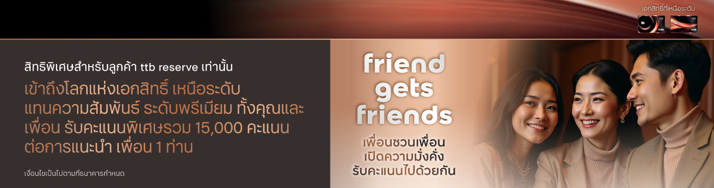 สิทธิพิเศษสำหรับลูกค้า ttb reserve ที่ร่วมแคมเปญ Friend gets Friends เพียงแนะนำเพื่อนเข้าร่วมโปรแกรมและทำตามเงื่อนไข จะได้รับคะแนนทั้งผู้แนะนำ และผู้ถูกแนะนำ