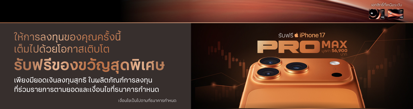 ลงทุนในในกองทุนรวมที่ร่วมรายการ และ/หรือ หุ้นกู้ที่มีอนุพันธ์แฝง อ้างอิงอัตราดอกเบี้ย อายุ 1 ปี ขึ้นไป ตามยอดที่ธนาคารกำหนด ของรางวัล ตั้งแต่ 6,000,000 -19,999,999 บาท Central Magic gift card รวมมูลค่า 5,000 บาท ตั้งแต่ 20,000,000 - 39,999,999 บาท Central Magic gift card รวมมูลค่า 20,000 บาท ตั้งแต่ 40,000,000 - 59,999,999 บาท iPhone Air 256GB สี Black มูลค่า 39,900 บาท ตั้งแต่ 60,000,000 บาทขึ้นไป iPhone 17 Pro Max 512GB สี Cosmic Orange มูลค่า 56,900 บาท สงวนสิทธิ์การมอบของสมนาคุณให้ลูกค้า 1 ท่าน ต่อ 1 ชิ้น โดยให้ของสมนาคุณที่มีมูลค่าสูงสุด ตลอดระยะเวลาโปรโมชัน