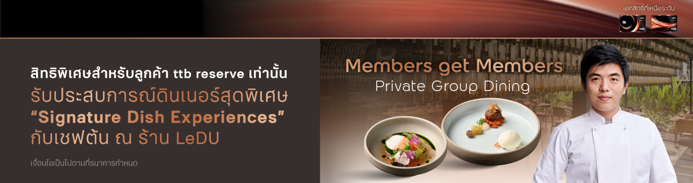 - ผู้แนะนำจะได้รับสิทธิ์พิเศษ Private Group Dining พร้อม “Signature Dish Experiences” กับเชฟต้น ณ ร้านอาหาร Le Du เมื่อผู้ถูกแนะนำทุกคนมียอดรวมผลิตภัณฑ์ (AUM) ใหม่ รวม 30 ล้านบาทขี้นไปจากผลิตภัณฑ์ 6 เดือนขึ้นไป และสมัครบัตรเครดิต ttb reserve infinite ครบทุกคนตามเงื่อนไข