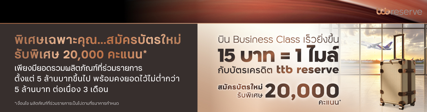 | รอบระยะเวลา | สมัครบัตรเครดิต ttb reserve ด้วยเงินฝาก / ลงทุน 5 ล้านบาทขึ้นไป และเปิดใช้งานบัตรเครดิต | คงยอดรวมผลิตภัณฑ์ไม่ต่ำกว่า 5 ล้านบาท และมียอดใช้จ่ายสะสมผ่านบัตรไม่ต่ำกว่า 200,000 บาท ภายใน 3 เดือนนับจากเดือนที่อนุมัติบัตร | รับคะแนนสะสมเข้าบัญชีบัตรเครดิต 20,000 คะแนน |