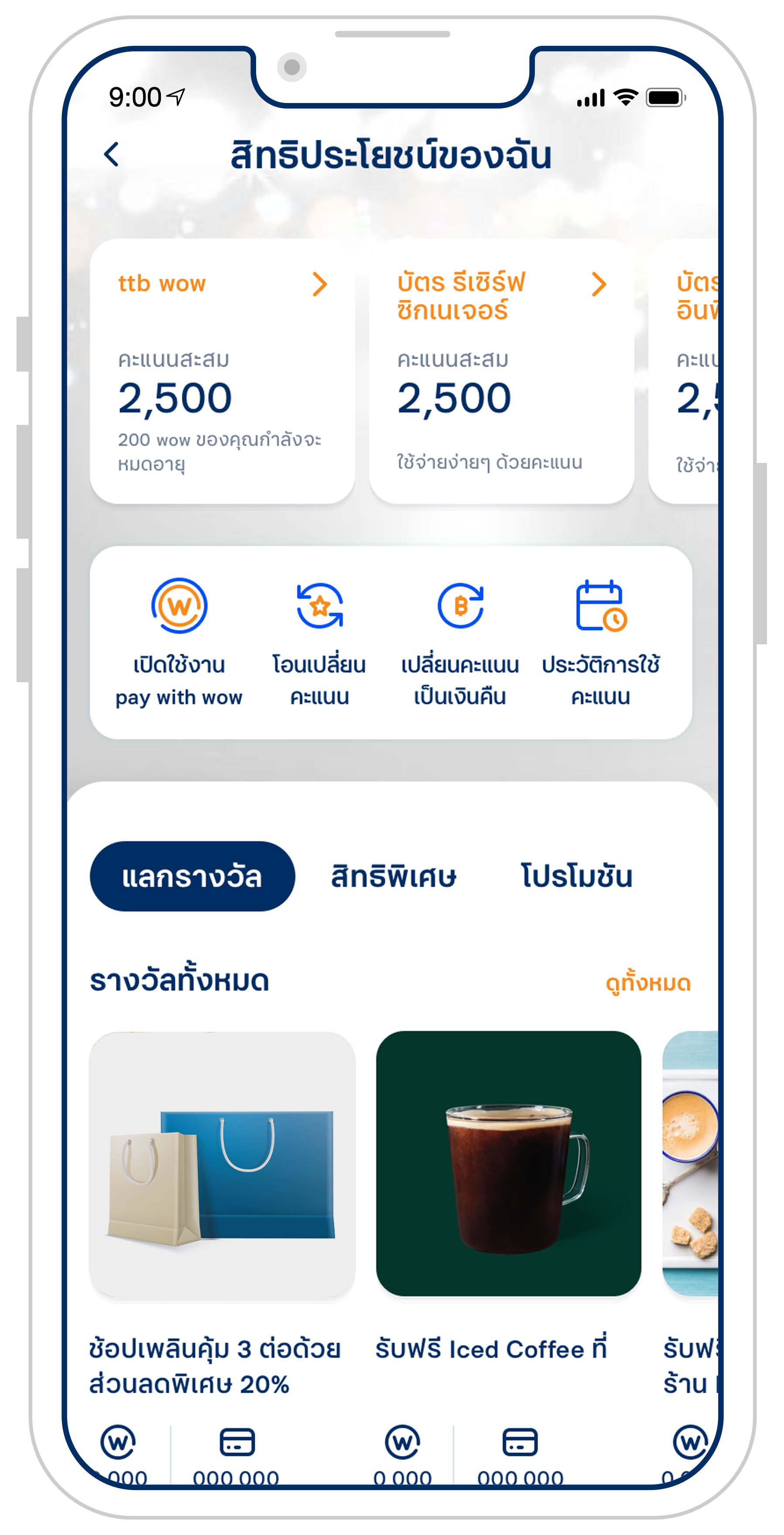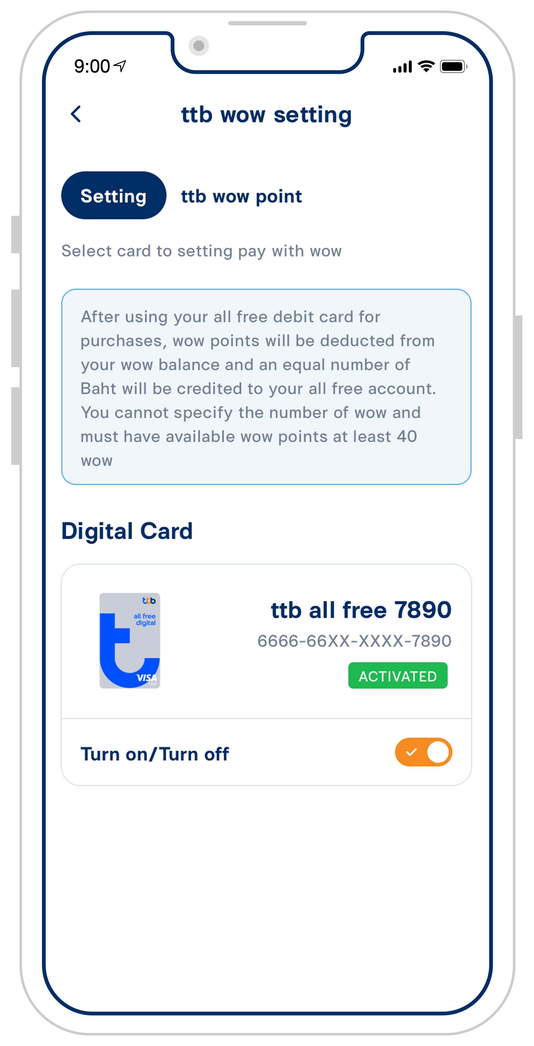 2. เข้าสู่หน้าตั้งค่า ttb wow และเลือก เปิด/ปิด pay with wow ของบัตร ttb all free ที่ต้องการใช้ได้เลย